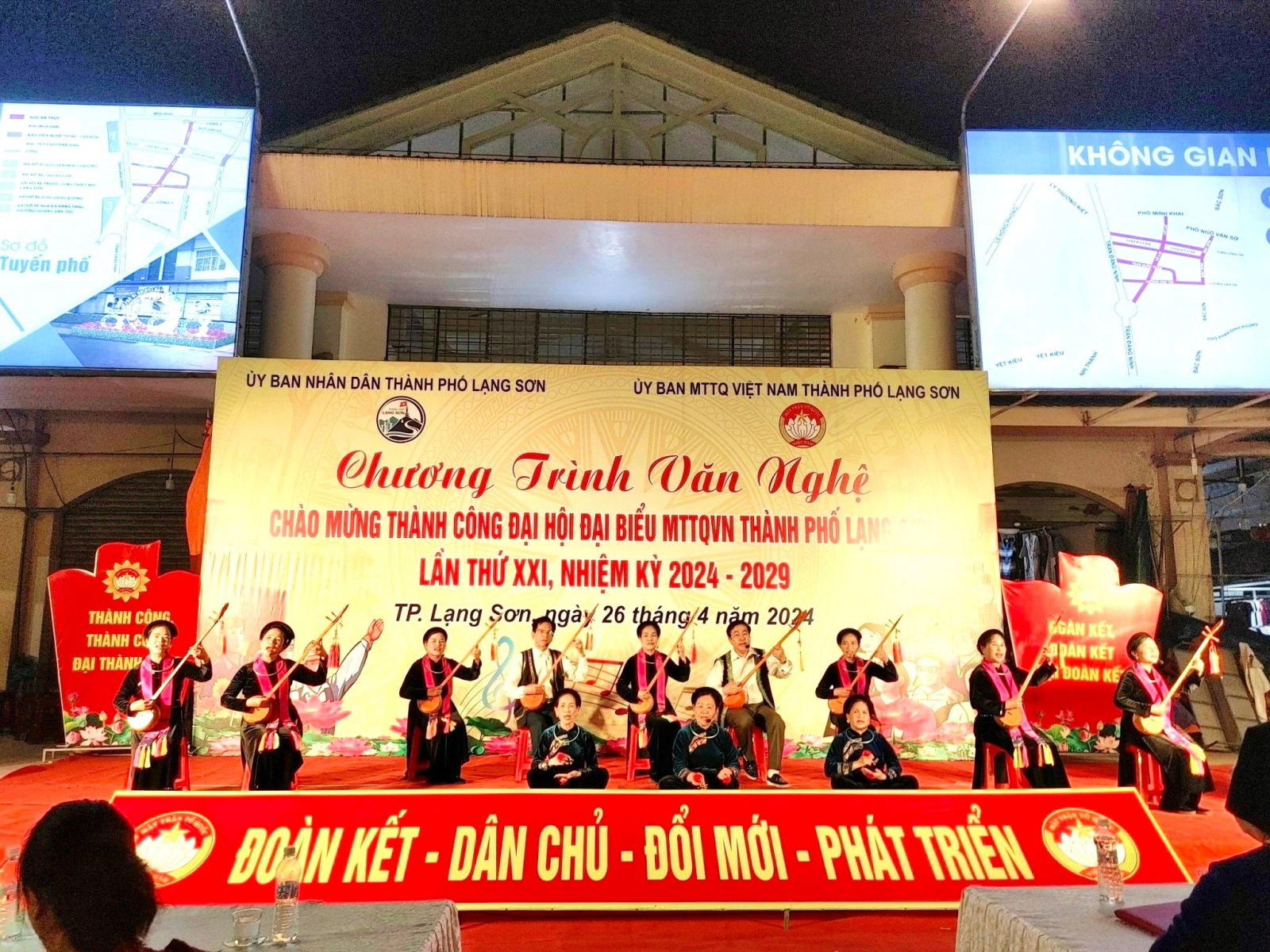 Mở đầu chương trình văn nghệ chào mừng, đồng chí Hoàng Thị Huyền - Ủy viên Ban Thường vụ Thành ủy, Chủ tịch Ủy ban MTTQ Việt Nam thành phố Lạng Sơn đã báo cáo nhanh kết quả Đại hội đại biểu Mặt trận Tổ quốc Việt Nam thành phố Lạng Sơn lần thứ XXI, nhiệm kỳ 2024 – 2029 và khai mạc đêm văn nghệ: Đại hội đại biểu MTTQ Việt Nam thành phố Lạng Sơn diễn ra trong 2 ngày 22 và 23/4/2024. Với chủ đề "Đoàn kết - Dân chủ - Đổi mới - Phát triển", Đại hội đã hiệp thương dân chủ cử 52 vị Ủy viên Uỷ ban MTTQ Việt Nam thành phố Lạng Sơn khóa XXI, nhiệm kỳ 2024 - 2029. Đại hội đã hiệp thương dân chủ cử 03 vị tham gia Ban Thường trực Ủy ban MTTQ Việt Nam thành phố Lạng Sơn khoá XXI, nhiệm kỳ 2024 - 2029; bà Hoàng Thị Huyền - Ủy viên Ban Thường vụ Thành ủy, tiếp tục tái cử Chủ tịch Ủy ban MTTQ Việt Nam thành phố khóa XXI. Đại hội đã hiệp thương dân chủ cử 10 đại biểu chính thức, 02 đại biểu dự khuyết đi dự Đại hội đại biểu MTTQ Việt Nam tỉnh Lạng Sơn lần thứ XV nhiệm kỳ 2024 - 2029.